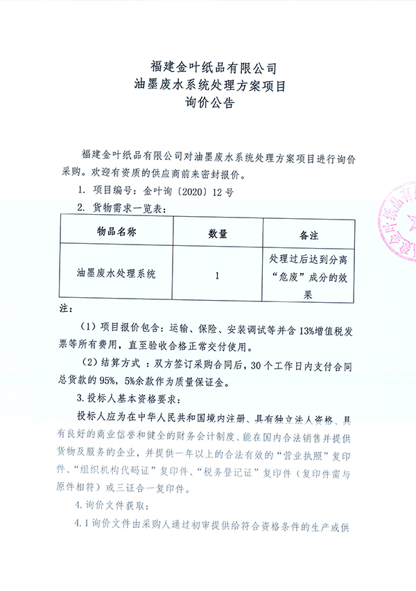 油墨廢水系統處理方案項目詢價公告