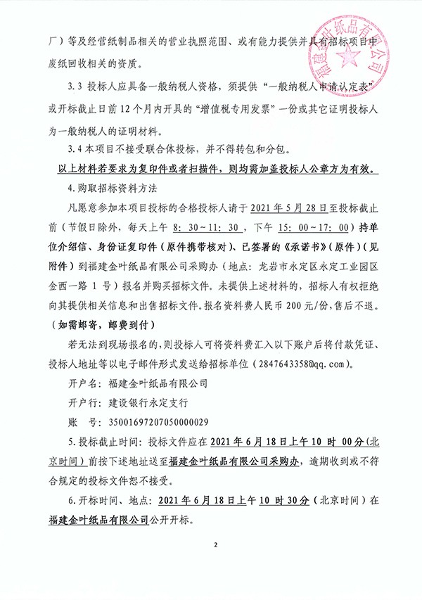 福建金葉紙品有限公司2021年廢紙處置項目招標公告